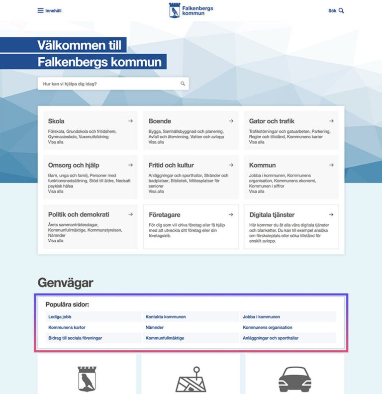 Falkenberg kommuns webbplats har som alla svenska kommunwebbplatser en stor mängd sidor med information om allt från badplatser till bygglov. Den här bredden på information gör att det dels kan vara svårt för besökaren att hitta den information man söker och dels gör arbetet svårt för administratörer och webbanalytiker.