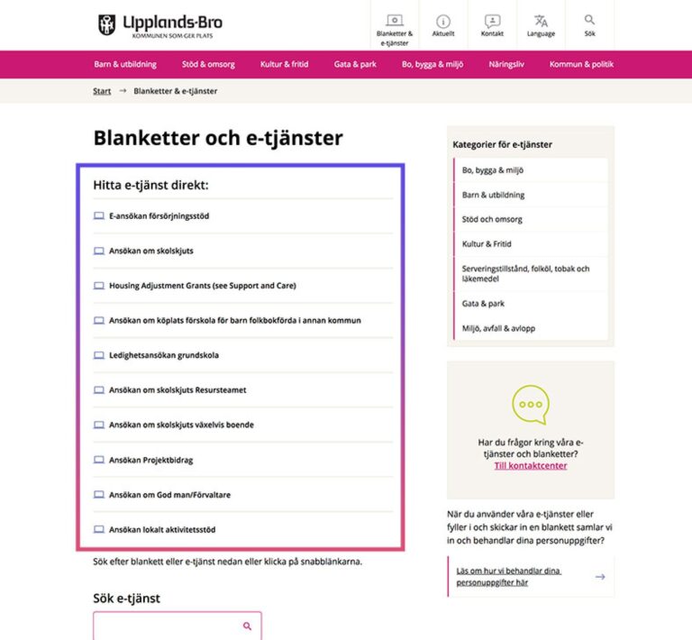 Upplands-Bro har på sin kommunwebbplats över 140 e-tjänster som alla finns listade på sidan Blanketter & e-tjänster. E-tjänsterna är desamma som ofta återfinns på en kommunwebbplats, allt från att ansöka om bygglov till specialkost i de olika skolorna.