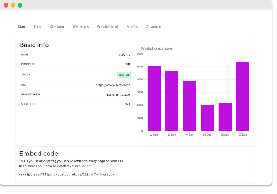 Den största vinsten är att rek.ai bidrar till en kraftigt ökad användarupplevelse på er sida. Tidigare resultat har visat på lägre exit, högre interaktion och lägre bounce rate. Det innebär också att du och kollegorna sparar kostnader och supporttid. Ni får också kvalificerade webbanalyser automatiskt via vår dashboard, analyser som i annat fall tar en liten evighet att göra manuellt.